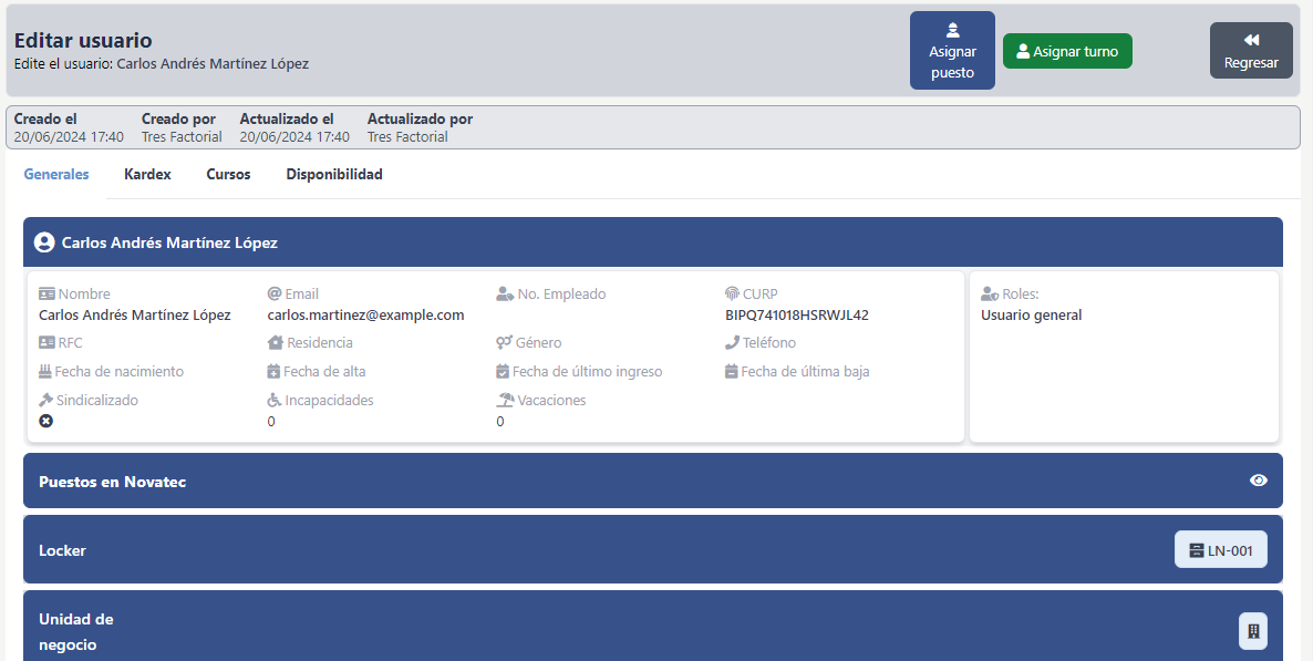 Esta pesataña le da la información general del usuario: su nombre, el correo, el curp, y la unidad de negocio, entre otros datos.